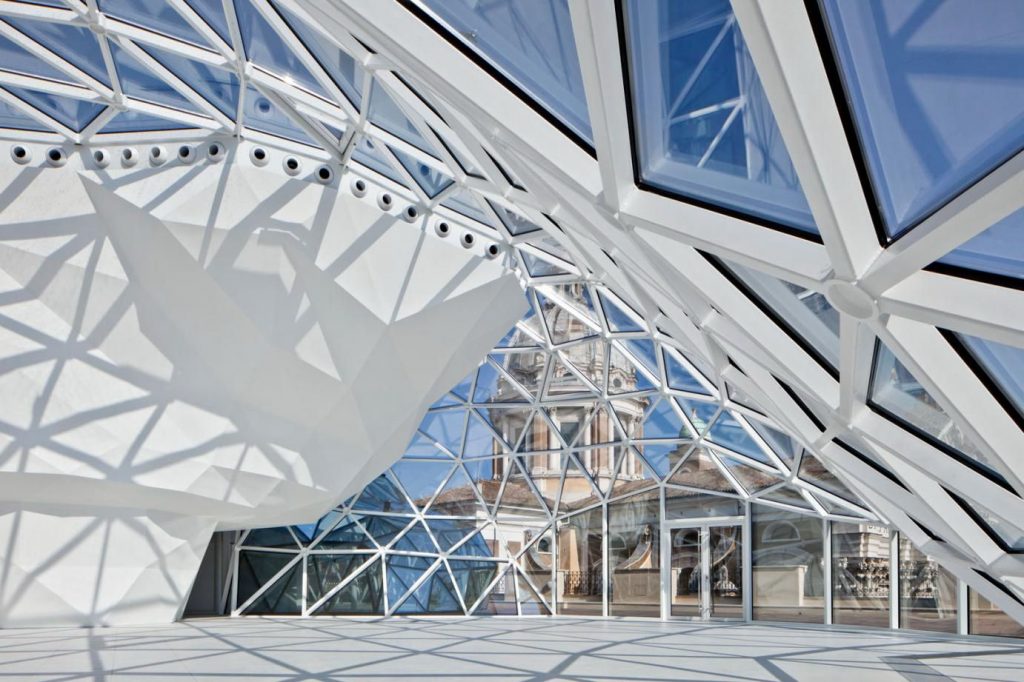 Designed by Massimiliano Fuksas The Lantern is a soaring, crystalline volume of steel and glass that slices vertically through all four floors of the palazzo. Its geometry, generated through parametric design, defies the orthogonal rigidity of the surrounding masonry. From the street, it reveals itself only in tantalising fragments, hinting at the drama within without breaking the façade’s historical continuity.